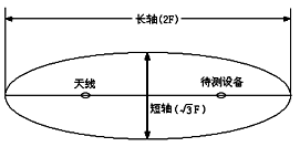 10kHz~1000MHz頻段的輻射測試場地應該是一個空曠、平坦的場地,在其邊界范圍內無架空線,附近無反射結構物(如鋼筋水泥建筑和高大樹木等),而且具有足夠大的尺寸,使天線、試品和反射結構物之間能充分分開。滿足標準的輻射測試場地應該是一個由長軸等于兩倍焦距(F)、短軸等于倍焦距的橢圓所包圍的場地,如圖1所示。試驗時,EUT和測量天線將分別處在兩個焦點上。