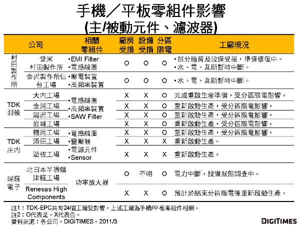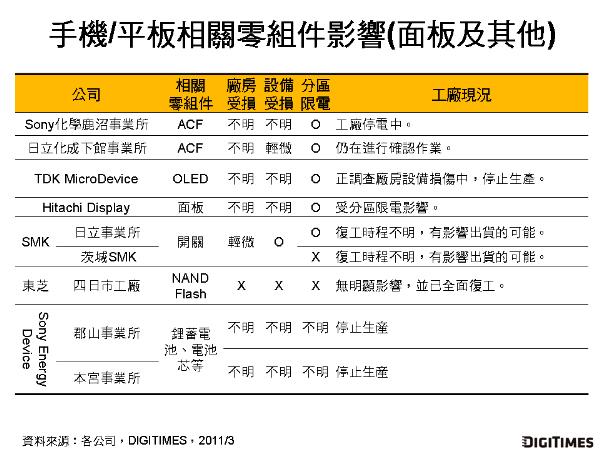 在面板、開關、存儲器、電池芯、異方性導電膜(ACF)等手機/平板相關零組件方面,除東芝位于四日市生產(chǎn)NAND Flash的工廠未受到日本311地震沖擊,其余包含TDK、日立顯示、日立化成、SMK、Sony化學、Sony Energy Device等業(yè)者的生產(chǎn)工廠,分別受到廠房、設備受損或停止生產(chǎn)的大小不等的影響。