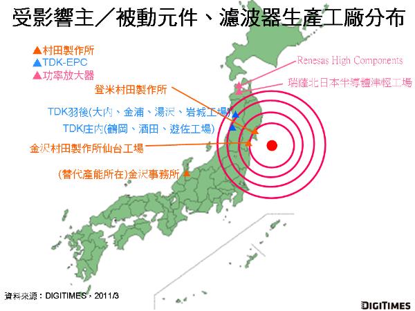 DIGITIMES Research最新報告指出,日本311強震造成日廠手機/平板相關零組件供應商分別遭受廠房、設備損壞,亦或海嘯沖擊、地方分區(qū)限電等影響,工廠作業(yè)停擺,影響超過20處工廠,在災后截至2011年3月16日仍未能正常作業(yè)。