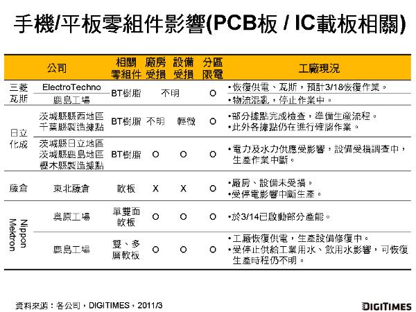 在手機/平板用PCB、IC載板材料BT樹脂等相關零組件方面,包含三菱瓦斯化學、日立化成、藤倉、Nippon Mektron等日廠旗下工廠受地震影響作業(yè)中斷,停止生產(chǎn)。