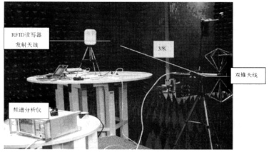 我們針對(duì)UHF頻段的相關(guān)已存在的業(yè)務(wù)進(jìn)行了RFID設(shè)備的兼容性測(cè)試(RFID讀寫器樣品帶外雜散發(fā)射測(cè)試圖樣例見圖2),由于標(biāo)簽相對(duì)讀寫器來(lái)說(shuō)功率較小,測(cè)試主要考慮讀寫器對(duì)公眾蜂窩通信的影響,特別是對(duì)易發(fā)生鄰頻干擾的GSM網(wǎng)絡(luò)。對(duì)無(wú)中心對(duì)講機(jī)系統(tǒng)也進(jìn)行了相關(guān)的實(shí)驗(yàn)室環(huán)境干擾測(cè)試。我們所使用的測(cè)試環(huán)境為EMC10米法半電波暗室、5米法全電波暗室,以及相關(guān)的真實(shí)環(huán)境。實(shí)驗(yàn)室測(cè)試配置如圖3所示。