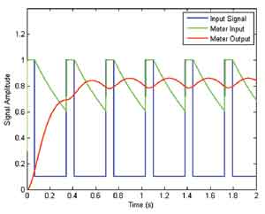 為幫助查看準(zhǔn)峰值檢波器與相關(guān)儀表組合的響應(yīng),圖2把輸入響應(yīng)(重復(fù)脈沖,用藍(lán)色表示)、得到的準(zhǔn)峰值檢波器響應(yīng)(具有響應(yīng)快、衰減慢的特點(diǎn),用綠色表示)及檢波器與儀表的綜合響應(yīng)(用紅色表示)分開。