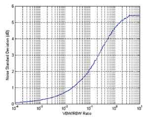 圖5 VBW/RBW之比對(duì)隨機(jī)噪聲信號(hào)標(biāo)準(zhǔn)偏差的影響。在VBW不小于3倍的分辨率帶寬時(shí),其對(duì)VBW的信號(hào)偏差沒有實(shí)際影響