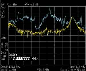 幸運(yùn)的是,測量技術(shù)的發(fā)展已經(jīng)可以滿足這些需求。上面介紹了如何使用實(shí)時(shí)頻譜分析儀發(fā)現(xiàn)瞬態(tài)信號(hào)和EMI隱患。在下面的實(shí)例中,單個(gè)的瞬態(tài)信號(hào)會(huì)產(chǎn)生一串瞬態(tài)信號(hào),這些信號(hào)每次只持續(xù)很短的時(shí)間。在本例中,該設(shè)備是一種嵌入式系統(tǒng),在把數(shù)據(jù)緩存到硬盤時(shí)導(dǎo)致了瞬態(tài)EMI.在使用掃頻分析儀的峰值檢波器簡單檢查后(黃色軌跡,如圖6所示),似乎只有一個(gè)連續(xù)信號(hào);把儀器保持Max-hold幾分鐘,同時(shí)循環(huán)DUT工作模式,會(huì)指明問題(藍(lán)色軌跡)。但在峰值檢波模式下進(jìn)行快速掃描會(huì)得到黃色軌跡,沒有檢測到問題。