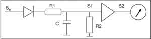 盡管許多EMI測量可以使用簡單的峰值檢波器完成,但EMI測量標(biāo)準(zhǔn)規(guī)定了一種專用測量方法,即準(zhǔn)峰值(QP)檢波器。QP檢波器用來檢測信號(hào)包絡(luò)加權(quán)后的峰值(準(zhǔn)峰值)。它根據(jù)信號(hào)時(shí)長和重復(fù)率加權(quán)多個(gè)信號(hào)。QP檢波器的特點(diǎn)是響應(yīng)快、衰減慢,包含一個(gè)表示臨界阻尼表的時(shí)間常數(shù)。發(fā)生頻次較高的信號(hào),其QP測量值要高于偶發(fā)的脈沖。