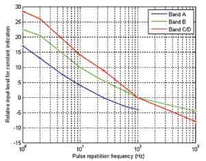 對(duì)于帶有QP檢波器的接收機(jī)上的常數(shù)指標(biāo),圖3表明了CISPR 16-1-1標(biāo)準(zhǔn)描述的幅度和重復(fù)頻率之間的關(guān)系。
