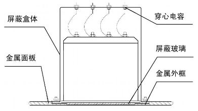 儀表窗口對設備來說是比較大的泄漏口,必須采取有效的措施將其屏蔽,為此采用加裝絲網屏蔽玻璃的方法對數字電流表、數字電壓表進行外部屏蔽。絲網屏蔽玻璃是由一種低阻抗的金屬絲網通過特殊工藝夾在兩層玻璃之間制成,絲網篩孔的密度決定其主要的屏蔽效能。如圖1 所示,由于玻璃周邊預留了10~ 20 mm 金屬絲網毛邊,通過螺裝金屬外框將它緊緊壓在機箱上,從而獲得連續的導電表面,以達到減少電磁泄露的目的。