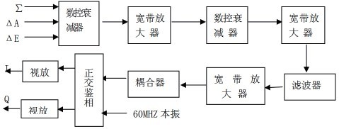 視頻接收組合是由I/Q正交鑒相器和視頻放大器組成。其中應用數(shù)控衰減器實時調整各路本振信號的相位,以達到補償接收機系統(tǒng)相位一致性的目的。最后輸出反射和應答的12路I/Q信號以及反射和應答的檢波信號。