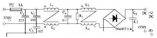 采用無(wú)源的EMI濾波器是抑制傳導(dǎo)干擾最有效的辦法。即在電路中插入一個(gè)帶通濾波器,讓50 Hz交流電暢通,其余頻率的信號(hào)受阻。但要嚴(yán)格控制濾波器LC元件的寄生參數(shù),它們的制作工藝、安裝位置、走線方式,都會(huì)影響EMI濾波效果。加接圖1所示的濾波電路,可以控制通過傳導(dǎo)耦合進(jìn)入電網(wǎng)的噪聲電平。