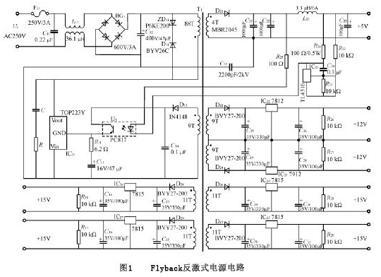 輸入為交流220V,經功率二極管整流橋變為直流作為反激變換器的輸入,輸出為三組直流:+5V,15V,12V,另外有一輔助電源5V,用來給光耦PC817供電。控制電路用反饋控制,選用TOPSwicth系列的TOP223Y芯片。