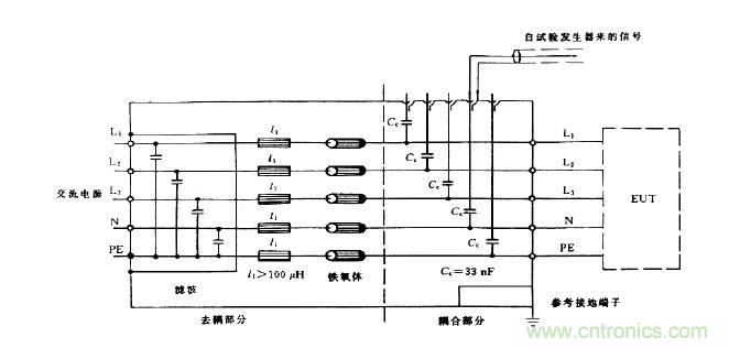作為佐證,我們利用電源線耦合/去耦網絡來加以說明:在圖中可以看到從試驗發生器來的信號電纜芯線通過可供選擇的耦合電容加到相應的電源線(L1、L2、L3、N及PE)上,信號電纜的屏蔽層則和耦合/去耦網絡的機殼相連,機殼則接到參考接地端子上。這就表明脈沖群干擾實際上是加在電源線與參考地之間,因此加在電源線上的干擾是共模干擾。