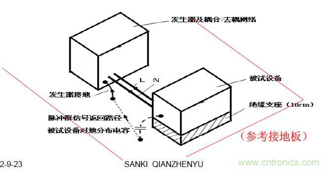 ③ 試驗儀器(包括脈沖群發生器和耦合/去耦網絡)放在參考接地板上。試驗儀器用盡可能粗短的接地電纜與參考接地板連接,并要求在連接處的阻抗盡可能地小。