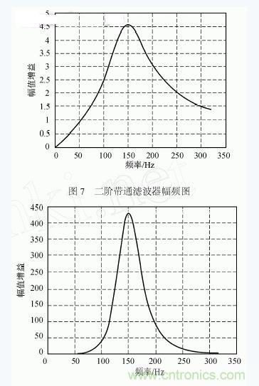 為此,我們對信號進行較高Q值的窄帶濾波,使用二階壓控型有源帶通濾波器作為濾波單元,其原理圖及頻率特性如圖6、7所示。