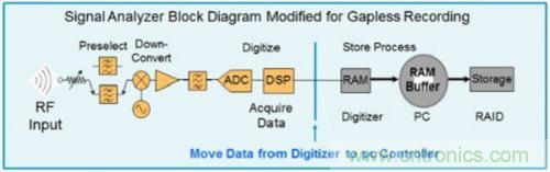 在對(duì)系統(tǒng)干擾進(jìn)行特征分析時(shí),系統(tǒng)工程師通常依賴信號(hào)分析儀來完成長(zhǎng)時(shí)間的連續(xù)錄存,如圖1所示。長(zhǎng)時(shí)間錄存的主要局限是,測(cè)試設(shè)備中板子的內(nèi)存容量不夠大。目標(biāo)信號(hào)首先進(jìn)入分析儀的RF輸入,隨后被處理,產(chǎn)生圖1右側(cè)所顯示的波形。假設(shè)系統(tǒng)使用了一個(gè)固定本機(jī)振蕩器,該儀器捕獲帶寬內(nèi)的所有目標(biāo)信號(hào)在到達(dá)藍(lán)色豎線之前,都會(huì)經(jīng)過實(shí)時(shí)處理。一旦采樣信號(hào)進(jìn)入緩存或RAM中,該儀器便不再關(guān)注新進(jìn)入的數(shù)字樣本。相反,它必須處理先前錄存的采樣數(shù)據(jù)。