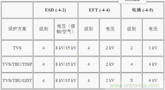 上一解決方案可提供最高四級ESD和EFT保護,但只能提供二級電涌保護。為了提高電涌保護級別,保護電路變得更加復雜。以下保護方案可以提供最高四級電涌保護。