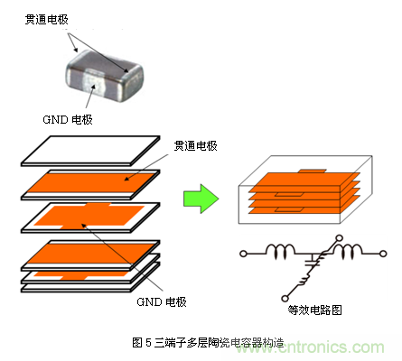 如圖5所示,片狀三端子電容器雖名為三端,但實(shí)為四端結(jié)構(gòu)。這是因?yàn)椋m然四端設(shè)計(jì)可減少接地端電感,但電氣特性方面,無論哪個(gè)端子都具備相同電位。而引線型三端子電容器原本就為三端結(jié)構(gòu),因此貼片化后仍被稱為"三端"。[page]