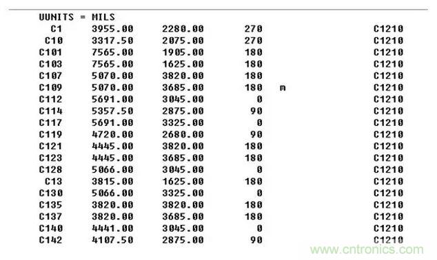 大家可以清晰可以的看到第一行表示的是單位mil。第一列是器件位號,第二列是X軸坐標,第三列是Y軸坐標,第四列是旋轉(zhuǎn)度數(shù),第五列是表示器件放在top面(空白)或者bottom面(m-Mirror的縮寫),第六列是器件封裝名。對于一個器件的定位信息來說,直接 感覺一下,似乎我們只需知道是哪個器件也就是器件位號,放置在哪一面,也就是在表面還是底面,旋轉(zhuǎn)度數(shù)以及具體的xy坐標,信息就全了。對于是哪種封裝類型似乎不是必需的,那么說到這,我想大家也就明白在遇到上述情況時,可以進行一些更為簡單的操作了。