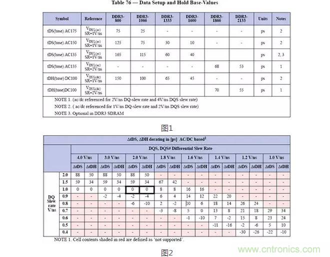 以DDR3信號(hào)為例,在JEDEC規(guī)范中規(guī)定了一個(gè)建立保持時(shí)間的基準(zhǔn)值(圖1),還有就是derating值(圖2),兩者之和就是所需的建立保持時(shí)間。