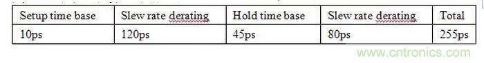 簡(jiǎn)單,可以用上面的公式計(jì)算出derating值,但上述公式只適用于>1v/ns的情況。然后和基準(zhǔn)值相加得到總的建立保持時(shí)間,如下表,總共所需的建立保持時(shí)間的總和是255ps。這樣就可以準(zhǔn)確的估算時(shí)序裕量了。