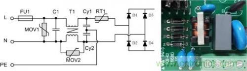 背景:以某型號的電源模塊為例,該模塊是周立功致遠電子為某客戶定制的電源模塊,輸入85VAC~350VAC,且EMC前級電路電路嵌入到模塊中。抗浪涌要求差模電壓3KV,共模電壓6KV。更換更大的保險絲后可承受6KV差模電壓。其前級原理圖及對應實物圖如圖2所示