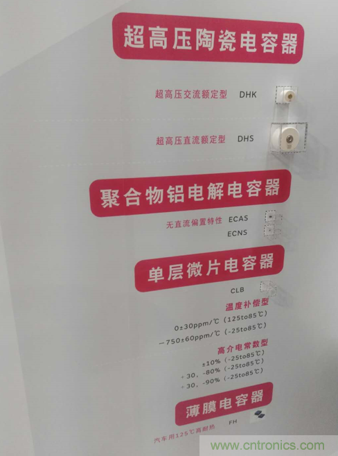 也許是由于近年來MLCC等電容器需求再次暴漲,村田在今年的展位上開始重新強(qiáng)調(diào)電容器這一傳統(tǒng)優(yōu)勢產(chǎn)品,并在現(xiàn)場展示了包括MLCC、超高壓陶瓷電容器、聚合物鋁電解電容器、單層微片電容器、薄膜電容器等極其豐富的電容產(chǎn)品線。