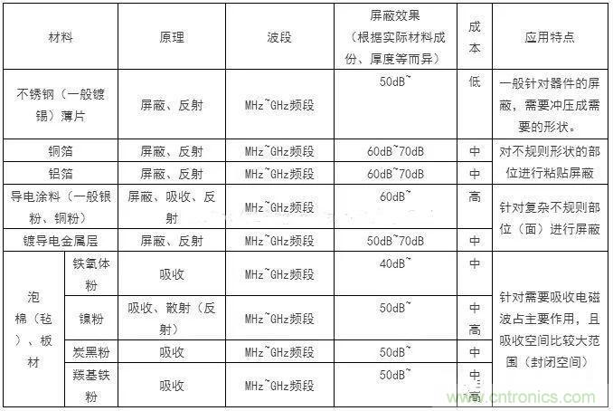 不銹鋼、銅箔、鋁箔、導電涂料、電磁波吸收材料(鐵氧體、鎳粉、碳黑、羰基鐵等)。