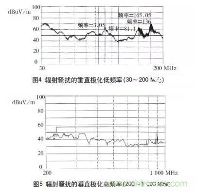 本開關電源一次通過了傳導騷擾的測試,測試波形如圖2、3所示。輻射騷擾高頻段230~1000MHz也測試合格,如圖5所示。只是在30~200MHz頻段范圍內的垂直極化指標超標,最大超標20dB,如圖4所示。