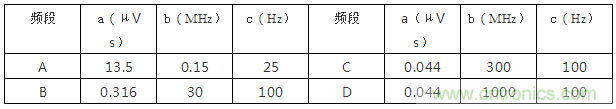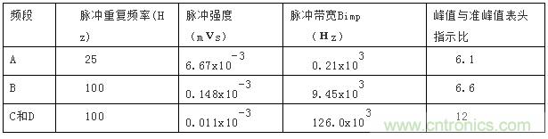 表3的含義是:在A、B、C、D各頻段內(nèi),分別輸入各自的標(biāo)準(zhǔn)周期脈沖,要求脈沖的幅度×寬度等于a(μVs),重復(fù)頻率為c(Hz),該周期脈沖的頻譜至少應(yīng)該在b(MHz)以下是均勻的,脈沖信號(hào)發(fā)生器的源阻抗應(yīng)和騷擾測(cè)量?jī)x輸入阻抗相等。對(duì)于該輸人信號(hào),騷擾測(cè)量?jī)x在該頻段的任何頻率上的讀數(shù)都應(yīng)該等于60dB(μV)。