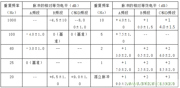 為了鑒別騷擾測(cè)量?jī)x是否達(dá)到了表2規(guī)定的四大類指標(biāo),標(biāo)準(zhǔn)又進(jìn)一步規(guī)定了騷擾測(cè)量?jī)x的絕對(duì)脈沖特性和相對(duì)脈沖特性。所謂絕對(duì)脈沖特性指輸人規(guī)定的周期脈沖信號(hào)時(shí)騷擾測(cè)量?jī)x的讀數(shù)應(yīng)達(dá)到規(guī)定的值。絕對(duì)脈沖特性見(jiàn)表3。