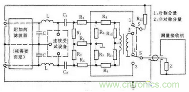 連續(xù)騷擾電壓測量主要測量EUT沿著電源線向電網(wǎng)發(fā)射的騷擾電壓,測量頻率為0.15~30MHz。測量一般在屏蔽室內(nèi)進(jìn)行。測量時(shí)需要在電網(wǎng)和EUT之間插入一個(gè)人工電源網(wǎng)絡(luò)(LISN或AMN),其原理如圖15所示。AMN的作用是隔離電網(wǎng)和EUT,使測到的騷擾電壓