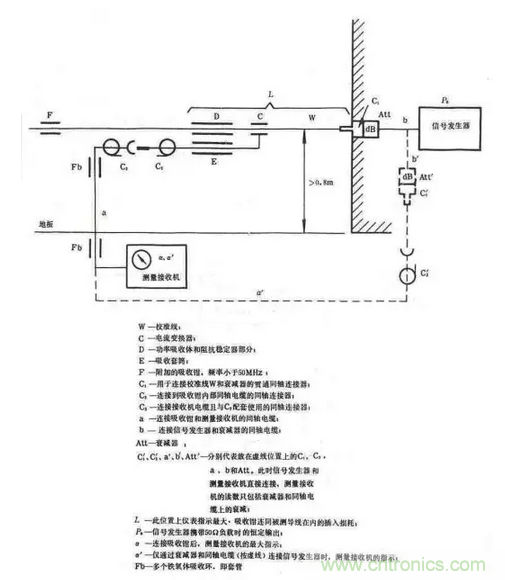 其中C是電流探頭,包括鐵氧體環(huán)和探測線圈,作用是測量電源線上的騷擾共模電流。D是鐵氧體環(huán)組,作為騷擾共模電流的穩(wěn)定負(fù)載,吸收騷擾功率,并用于隔離EUT和電網(wǎng)。如果在50MHz以下鐵氧體環(huán)組D不能充分起到射頻隔離作用,則應(yīng)在電網(wǎng)端再加一個(gè)輔助吸收鉗F,它也是由鐵氧體環(huán)組成。E也是鐵氧體環(huán)組,用于吸收外場在電流探頭引出電纜上產(chǎn)生的共模電流,以免影響測量結(jié)果。測量布置如圖19(b)所示,測試應(yīng)在屏蔽室內(nèi)進(jìn)行,電源線長度應(yīng)大于6m,即大于30MHz的半波長加上吸收鉗的長度。對(duì)于每一個(gè)測試頻率點(diǎn),吸收鉗都應(yīng)沿著電源線移動(dòng),找出最大值,因?yàn)楣材k娏髟趯?dǎo)線上是以駐波形式出現(xiàn)的。功率吸收鉗測量系統(tǒng)應(yīng)事前進(jìn)行校準(zhǔn),得到修正因子—頻率曲線。校準(zhǔn)布置如圖20所示。