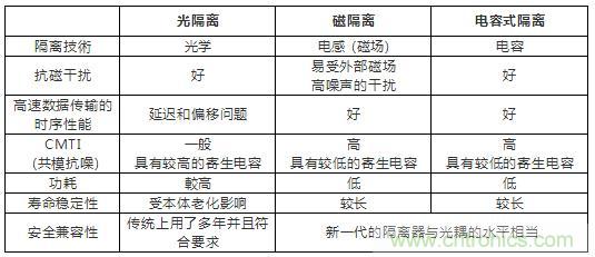 無論是光隔離、磁隔離或是電容式隔離,只要在適當?shù)臈l件下工作都可以達到很出色的隔離效果。下圖是一個三種隔離技術(shù)的簡單比較: