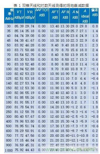 表1:雙錐天線和對(duì)數(shù)天線測(cè)得的場(chǎng)地衰減數(shù)據(jù)