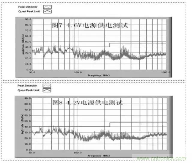 因為傳導、輻射的數值與dv/dt 或者 di/dt成正比,所以電壓越高,傳導、輻射的數值越大。樣品的供電電壓是4.6V,當電壓調整供為4.2V后,從實驗數據可以看出,發現尖峰毛刺也能得到一定改善(圖7、圖8)。