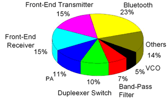 LTCC器件按其所包含的元件數(shù)量和在電路中的作用,大體可分為L(zhǎng)TCC元件、LTCC功能器件、LTCC封裝基板和LTCC模塊基板。LTCC屬于高新科技的前沿產(chǎn)品,廣泛應(yīng)用于微電子工業(yè)的各個(gè)領(lǐng)域,具有十分廣闊的應(yīng)用市場(chǎng)和發(fā)展前景。目前LTCC 技術(shù)已經(jīng)進(jìn)入更新的應(yīng)用階段,包括無線區(qū)域網(wǎng)絡(luò)、地面數(shù)位廣播、全球定位系統(tǒng)接收器組件、數(shù)位信號(hào)處理器和記憶體等及其他電源供應(yīng)組件甚至是數(shù)位電路組件基板。例如,村田、三菱電工、京瓷、TDK、Epcos、日立、Avx等十多家開發(fā)的手機(jī)無線開關(guān)組件,NEC、村田和和易利信等開發(fā)的藍(lán)牙組件都是由LTCC技術(shù)制成的。此外,LTCC組件因其結(jié)構(gòu)緊湊,高耐熱和耐沖擊性,目前在軍工和航天設(shè)備中廣泛應(yīng)用,預(yù)計(jì)未來在汽車電子系統(tǒng)上的應(yīng)用也會(huì)非常普遍。CTS 公司已經(jīng)宣布將為汽車電子市場(chǎng)提供低溫?zé)Y(jié)陶瓷(LTCC)電路板。圖6為目前LTCC器件應(yīng)用領(lǐng)域所占比例。