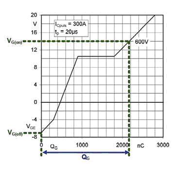 柵極電荷可以通過一個簡化的測試電路進行測量。當柵極電壓VGE用示波器進行測量時,柵極由一個恒流源(QG=I*t)驅動。所確定的柵極電荷曲線(圖3)可被用來計算驅動IGBT所需的每脈沖柵極電荷。