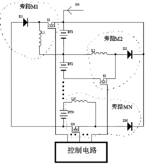 4.運用分時原理,通過開關組件的控制和切換,使額外的電流流入電壓相對較低的電池中以達到均衡充電的目的。該方法效率比較高,但控制比較復雜。