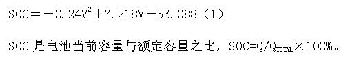 充電時電池的荷電狀態SOC(stateofcharge)可由下面的經驗公式來得出,其中V是電池的端電壓。