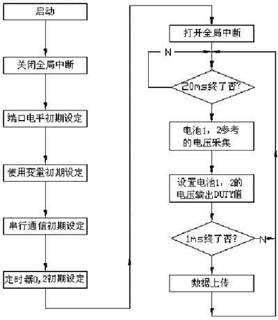 為了驗證本文的均衡充電方法,以兩節單體電池組成的蓄電池組為例進行實驗和分析,主要驗證旁路中開關管對電壓的調節作用。控制流程見圖4。
