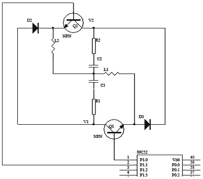 本實驗中,選用兩個小功率NPN管C1815(Q1、Q2)來替代開關管,用89C51芯片的P1.0和P1.1腳控制Q1、Q2的開關。同時,蓄電池的端電壓V1和V2由差動放大電路采集,經A/D轉換送到CPU。在整個過程中,電壓每20ms采樣一次,每隔1s上傳上位機并保存并自動繪制曲線。圖5為試驗電路圖。