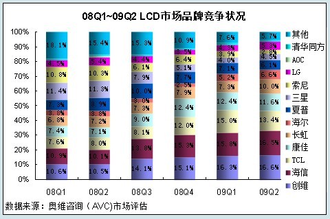 T6陣營(TCL、創(chuàng)維、海爾、海信、長虹、康佳)在2008年,借助“奧運(yùn)攻勢”等活動發(fā)力,并通過產(chǎn)品線的不斷更新定義,終端渠道的投入及價(jià)格戰(zhàn)等逐步確立主導(dǎo)地位。但由于受面板價(jià)格上升及缺貨的影響,2009年二季度國內(nèi)品牌市場地位容易下滑,S3(三星、索尼、夏普)挾技術(shù)及面板資源攻守兼?zhèn)洌瑫r(shí)LG、冠捷、清華同方品牌也正發(fā)力提升LCD電視市場銷售,市場競爭愈加激烈。