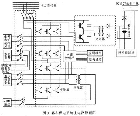 DC600V空調客車供電系統采用機車集中整流,客車分散逆變方式,構成了整個列車的交一直一交變流供電系統。工作過程為:電力機車將25kV電網單相交流電降壓、整流、濾波成DC600V后給客車供電,客車根據用電設備的需要,將機車提供的DC600V變換成單、三相交流電及DC110V。系統采用兩套獨立供電。具有一定的冗余,客車供電的基本原理圖如圖3所示。