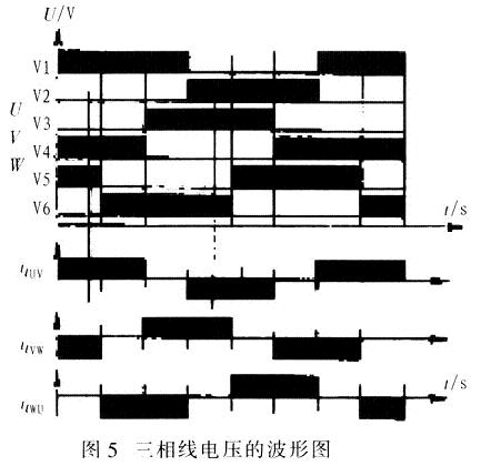 (5)由V1~V6組成的橋式三相逆變主電路是逆變器的核心電路。圖4為三相逆變器的主電路圖,輸入端為A、B,輸出為U、V、W。圖5中V1~V6的導通順序,陰影部分為各個IGBT的導通時間。每一格的時間為π/3,三相線電壓的波形如圖5所示。
