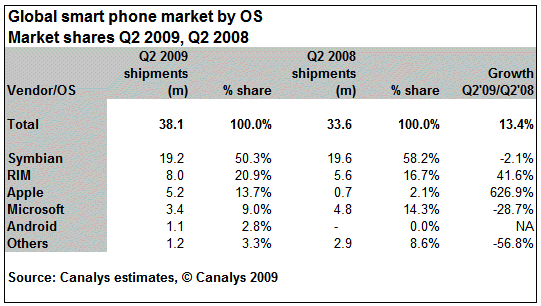 根據操作系統所統計的第二季全球智能手機市場份額中,Symbian系統智能手機銷量為1920萬部,同比減少2.1%,占整體智能手機銷量的52%;RIM操作系統智能手機銷量為800萬部,同比增長了41.6%;蘋果操作系統手機銷量為520萬部,同步增長626.9%;微軟操作系統手機銷量為340萬部,同比下降28.7%;谷歌Android操作系統手機銷量為110萬部。