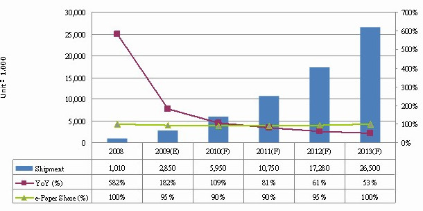 由于電子紙潛在市場可觀,加上全球電子書銷售量持續(xù)增長,更為電子紙的應用注入強心劑。根據(jù)Andrew Tribute研究數(shù)據(jù)指出,全球電子書內容銷售量每月約為40萬本,預估2010年數(shù)字數(shù)據(jù)的產(chǎn)量將與紙本數(shù)據(jù)平分秋色,2020年數(shù)字數(shù)據(jù)的市場占有率更達65%,數(shù)字出版增長動能大增,各式電子閱讀器也紛紛出籠,勢不可擋。