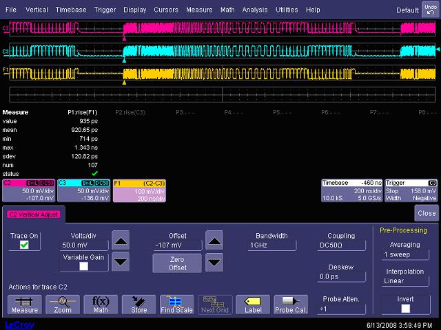 我們知道,帶寬的限制對信號的捕獲會帶來下面的影響:1,使被測信號的上升沿變緩。2,使信號的頻率分量減少。3,使信號的相位失真。 那么,“對于5MHz的時鐘信號,需要用多少帶寬的示波器來測量?” 這是我在培訓時常問的一個問題。我很少能得到令我滿意的答案,很少有工程師反問我:“這5MHz的時鐘信號是方波還是正弦波,如果是方波,其上升時間是多少?” 我常得到的回答是,“100MHz帶寬就足夠了,示波器帶寬通常是被測信號頻率的3-5倍,100MHz余量很大了。” 圖13顯示了5MHz的方波信號在不同帶寬時測試出的波形。其中,M1和M2是分別在6GHz和1GHz時波形,C3是帶寬限制到200MHz的測試結果。 圖14顯示在帶寬限制到200MHz時測量出的5MHz的上升時間均值為本1.70357ns,而圖15顯示的是在6GHz帶寬時的上升時間為873.87ps。這表明,對于 5MHz的時鐘,因為其上升時間比較快,最好用1GHz以上帶寬的示波器來測量其上升時間,200MHz時其上升沿變緩; 1GHz帶寬和6GHz帶寬對于測試800ps的上升時間結果幾乎一樣。