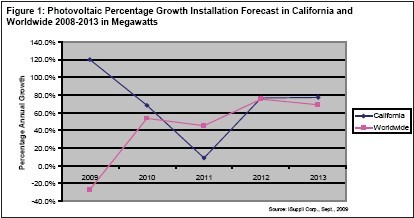 圖1所示為iSuppli公司對于2009至2013年加州以及全世界光伏系統安裝增長情況的預測。