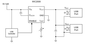 圖7是一種輸出限制電流可調(diào)節(jié)的USB端口電路。該電路由MIC2008作功率分配開關(guān),由USB控制器對(duì)功率分配開關(guān)實(shí)現(xiàn)控制。限定的電流由外設(shè)電阻R來設(shè)定(限制電流范圍為0.2~2.0A)。該功率分配開關(guān)的輸出電壓上升率(啟動(dòng)時(shí)間)可由外設(shè)電容C來設(shè)定,內(nèi)部有過熱保護(hù)及輸入電壓過低時(shí)輸出鎖存保護(hù)。