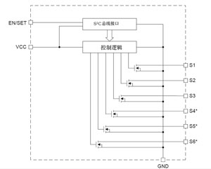 該器件主要特點(diǎn):輸入電壓范圍為1.8~5.5V;內(nèi)部有6個(gè)低端N溝通MOSFET開關(guān),每個(gè)開關(guān)都是獨(dú)立的;可采用單個(gè)串行控制線(S2C線)對(duì)各個(gè)開關(guān)實(shí)現(xiàn)通、斷控制;靜態(tài)電流少,典型值為3μA;每個(gè)開關(guān)可驅(qū)動(dòng)208mA;無須其他外圍元件;12引腳TSOP封裝;工作溫度范圍-40~+85℃。