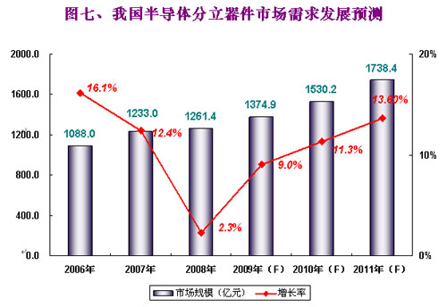 2008年我國分立器件產(chǎn)銷的一大亮點主要得益于全球電子整機對節(jié)能、環(huán)保需求的不斷增長,這一方面帶動了分立器件產(chǎn)品的需求增長,另一方面也帶動了市場產(chǎn)品結(jié)構(gòu)的快速升級。銷售額在LED產(chǎn)業(yè)大幅增長的帶動下仍增長了12.3%,在二極管、三極管增速相對平穩(wěn)之時,而以MOSFET和IGBT為主的功率晶體管的廣泛應(yīng)用于PC、筆記本電腦、計算機電源配件、液晶電視等而得到提升。2008年我國分立器件產(chǎn)量達(dá)到2461.13億只,同比下降1.1%;2008年我國分立器件銷售額達(dá)到937.8億元,同比增長12.3%。(CSIA、CCID年度報告)